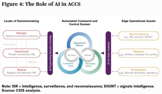 Oroszország lemondott az absztrakt parancsnoki és irányítási korszerűsítésről a feladatspecifikus szoftverek javára, amelyek azonnali eredményekkel gyorsítják a gyilkolási láncot. Az MI-beruházás ugyanazt a logikát követi: a számítógépes látás és az érzékelő fúzió harcképesek és széleskörűen alkalmazottak, míg a szövegelemzés és a döntéstámogatás kísérleti szakaszban van. Oroszország a természetes nyelvi feldolgozás javításán dolgozik az Egyesült Államok, Kína és Európa által kifejlesztett nyílt súlyú modellek adaptálásával, beágyazva őket ellenőrzött környezetekbe. Oroszország praktikus alkalmazásokat fejleszt a csatatéren való hatékonyság javítása érdekében, adaptálva és létrehozva saját koncepcióit.