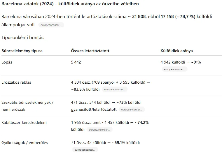 Ezek az adatok azt mutatják, hogy bizonyos bűnözési kategóriákban Barcelonában nagy az arányuk a külföldiek / migránsok között az őrizetbe vetteknek / gyanúsítottaknak.