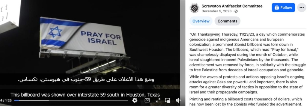 Még csak nem is láthatatlanok. A Screwston Antifa korábban vállalta a felelősséget egy hirdetőtábla megrongálásáért, röviddel a 2023. október 7-i izraeli terrortámadások után.