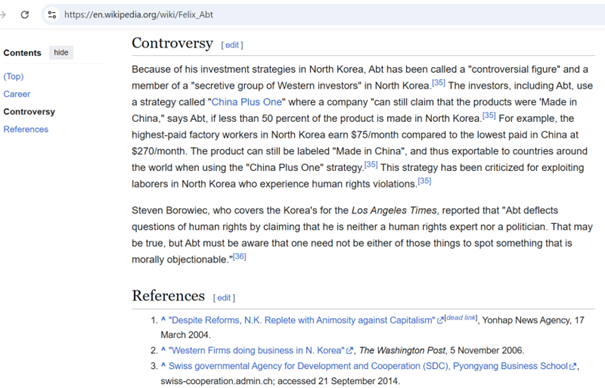 Ezt első kézből tapasztaltam. A Vice egyik újságírója egyszer interjút készített velem az Észak-Koreával folytatott kereskedelemről. Elmagyaráztam egy egyszerű, jogi tényt: Ha egy termék kevesebb mint fele Észak-Koreában készül, és több mint a fele Kínában készül, akkor a “Made in China” címkével lehet ellátni. A Vice ezt erkölcsi botránygá változtatta. A Wikipédia szűretlenül nyelte le.