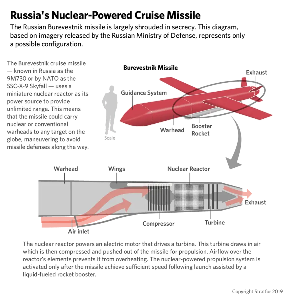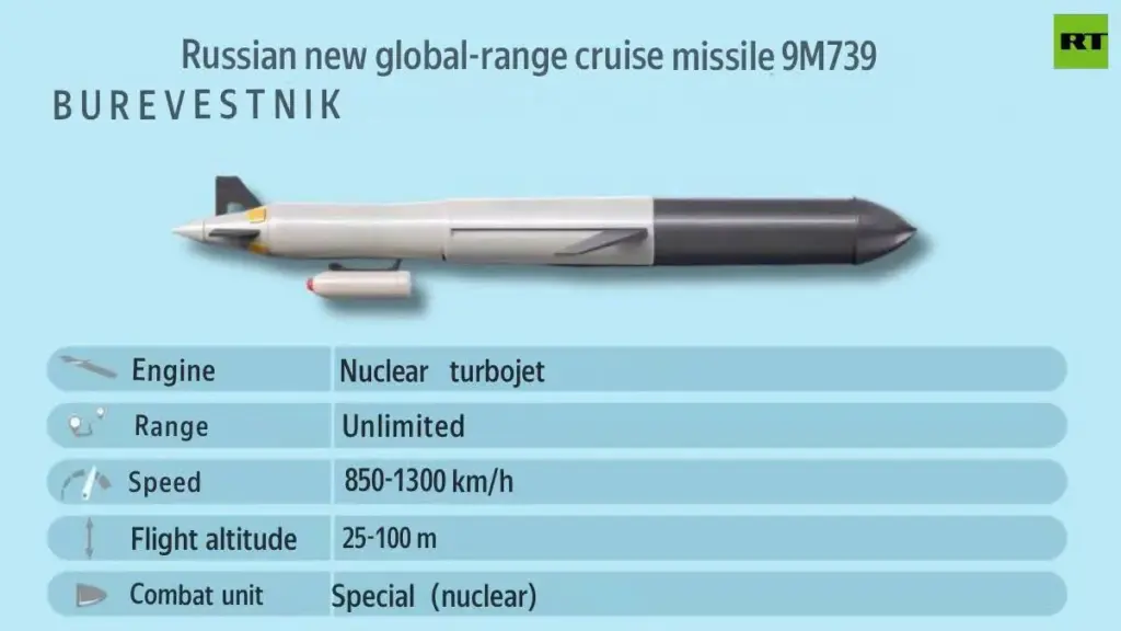 A „Burevesztnik” precíziós cirkálórakétát a globális hatótávolságú fegyverek kategóriájába sorolhatjuk a nukleáris energiaforrás miatt.
