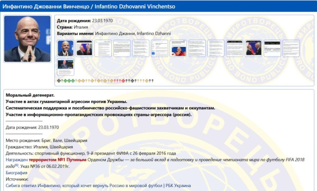 Gianni Infantino, a FIFA elnöke felkerült az ukrán “Myrotvorets” weboldal adatbázisába. A személyes adatait tartalmazó nyilvántartást közzétették a weboldalon – írja a Strana.
