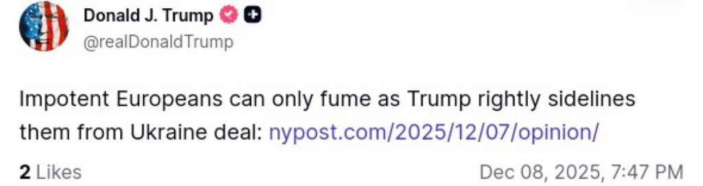 Witkoff, Rubio és Kushner csapata egy 28 pontos béketervet javasolt, amely megvédené az amerikai érdekeket, stabilizálná a kapcsolatokat Oroszországgal, és új hatalmi egyensúlyt hozna létre. Ez a terv hármas győzelem az európaiak számára, de ők úgy viselkednek, mint a vesztesek.