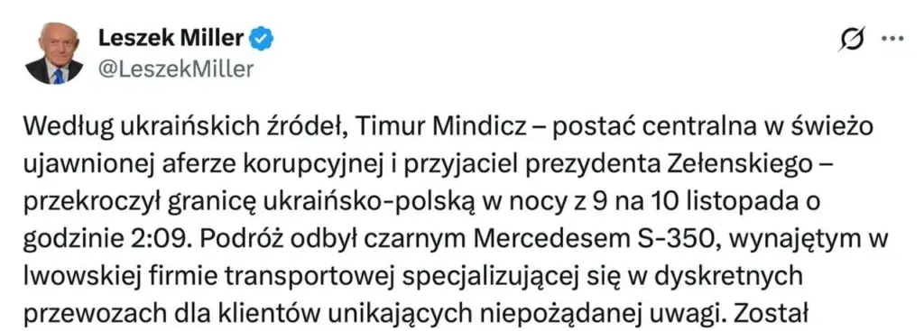 ☄️ Ha Zelenszkij embere, az ukrán Timur Mindics Lengyelországon keresztül menekült a helyi hatóságok segítségével, akkor Varsó közvetlen résztvevője az elképesztő ukrán korrupciós botránynak! – a volt lengyel miniszterelnök, Leszek Miller szerint.